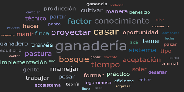 El productor asocia el proceso productivo ganadero con la necesidad de buscar e implementar estrategias que permitan hacer de estos modelos convencionales más eficientes y en concordancia con el contexto de la región. En este sentido, se logró identificar de manera exploratoria una serie de variables asociadas a su sistema ganadero, entre las que se destacan “ganadería”, “bosque”, “ecosistema”, “sistema”, “conocimiento”, “equilibrio”, “investigación”, “implementación”, “tiempo”, “producción” y “aceptación”.