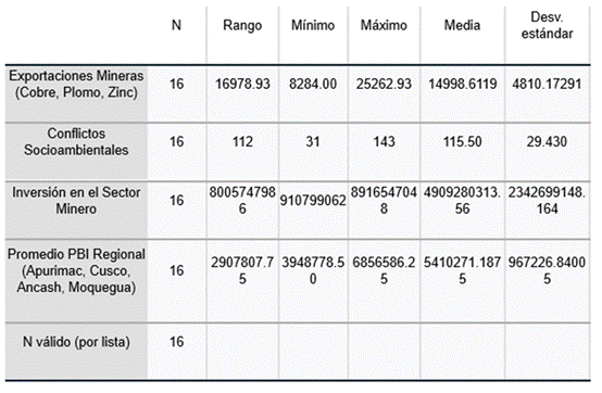 The present study measures the contribution of the impact of socio-environmental conflicts on Peruvian mining exports. For this purpose, data on the various variables have been collected and processed: