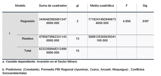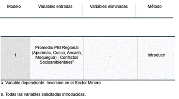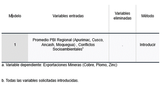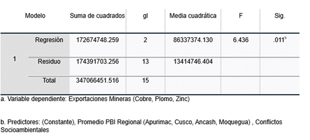 The purpose of this research is to examine the impact of socio-environmental conflicts on mining exports in Peru during the period 2007-2022. To achieve this objective, the multiple linear regression method was used, employing the statistical programme SPSS. The results of the analysis showed that, although the model as a whole is significant (calculated p = 0,011 < tabulated p = 0,05), the coefficient for Socio-Environmental Conflicts did not reach statistical significance (calculated p = 0,627 > tabulated p = 0,05). This suggests that the significance of the overall model appears to be due to the intervention of our control variable, regional GDP. This finding highlights the need for more in-depth and detailed research on the relationship between socio-environmental conflicts and mining exports in Peru, considering possible additional factors or alternative methodological approaches to better understand this complex dynamic.