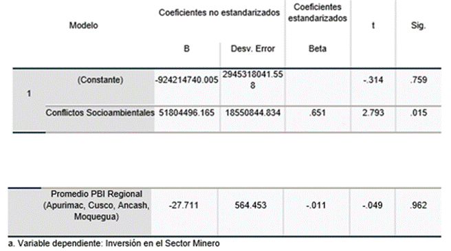 According to figure 9, the coefficient for Socio-environmental Conflicts is 51,804,496,165, suggesting a positive relationship with mining investment. This coefficient is statistically significant (p = 0,015). Likewise, the coefficient for Regional Average GDP is -27,711, indicating a very small negative relationship with mining investment. However, this coefficient is not statistically significant (p = 0,962).