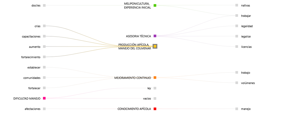 Using terms such as “training, strengthening, and law” has indicated the need for institutional and technical support for producers, according to (9) training programs are fundamental for optimizing management practices and ensuring the viability of the productive system. Additionally, incorporating terms such as “law and license” indicates a concern for the regulation and formalization of the activity. This issue has become critical in nations where beekeeping is beginning to be recognized as an important economic activity. The emphasis on words such as “future, increase and strengthening” reflects an optimistic but cautious view of the development of the activity. According to (10) who highlights the potential of beekeeping to contribute to sustainable development in tropical regions, adequate support policies are implemented. In conclusion, the word cloud emphasizes a mixture of fundamental issues in meliponiculture: production, the challenges faced, the demand for institutional support, and the future outlook for the activity. These findings align with the existing literature, highlighting the relevance of addressing technical and environmental challenges while promoting sustainable development through training and defined policies. (18,19,20)