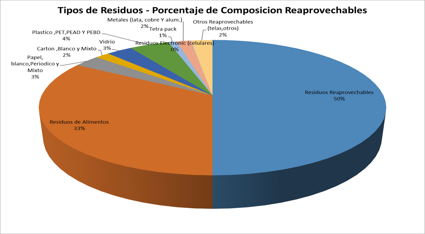 2. Through our study of the characterization of household solid waste, we have identified all types of household solid waste through daily collection over seven days from a representative sample of the three socioeconomic levels, with the support of our recyclers hired for this purpose, which is detailed in Table 18, Physical composition of household solid waste in the district of Villa El Salvador.