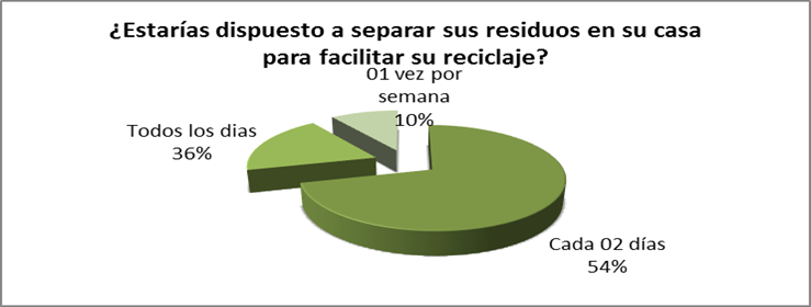 Los vecinos que pertenecen al programa ¨Bono verde ¨reciben una capacitación constante, separan y guardan sus residuos reciclables para entregarlo a los segregadores, el 72 % de los vecinos considera que la labor que desempeñan los segregadores es un trabajo como cualquier otro y que es muy importante porque contribuye positivamente a la limpieza del distrito. Existen algunas urbanizaciones que no se hallan involucradas totalmente con este programa.(15,16,17)