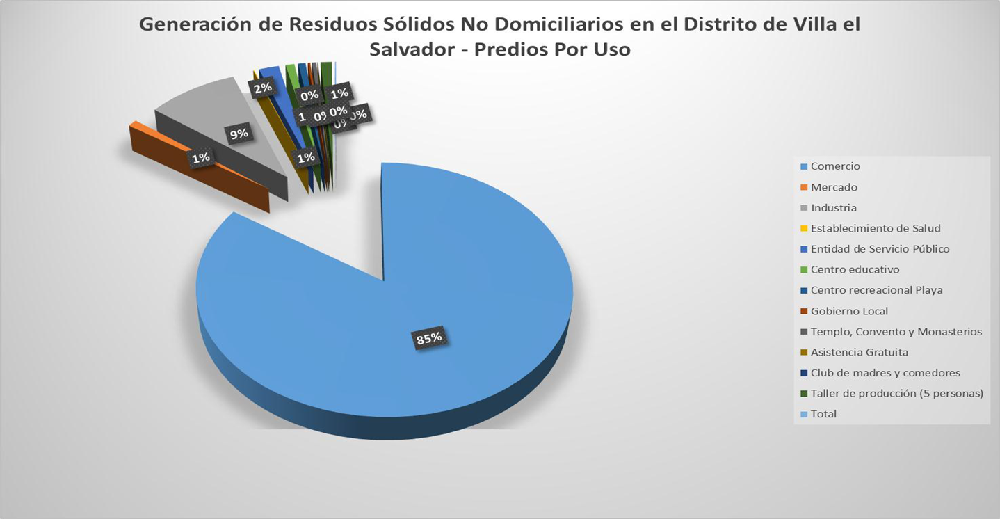 3. Existe un grupo muy grande de usos de los residuos sólidos tanto domiciliarios como no domiciliarios. Esto no permite un ordenamiento claro de la emisión de las diferentes licencias municipales para diversos rubros por lo tanto el vecino utiliza una licencia determinada para hacer otras cosas. Este estudio nos Ha permitido localizar estos puntos y por ende un ahorro muy sustancioso a las arcas de la municipalidad de Villa El Salvador. Los resultados indican que existe una producción de residuos no domiciliarios de 153,13 Ton/día.